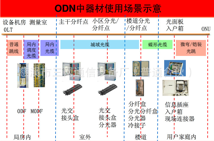 三网通信为适应三网融合、FTTx的推广,三网通信推出从局端一直到用户桌面的FTTX光配线网络解决方案。产品主要包括光缆交接箱,光缆分纤箱,分光分纤箱,光缆分线盒,光缆接头盒,光缆终端盒,冷接子,快速连接器,光纤跳线,配线光缆、皮线光缆、市内布线光缆、无源器件、线路辅助设施等。